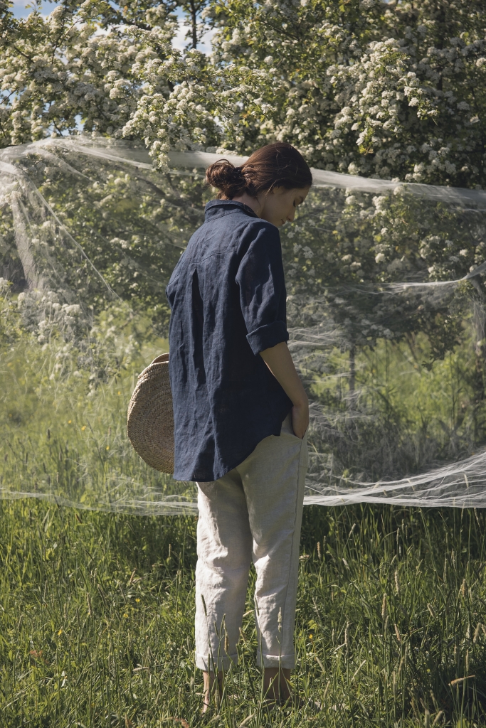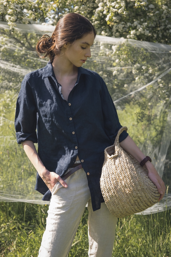 Koszula lniana w rozmiarze uniwersalnym, uszyta jest z przyjemnej w dotyku, zmiękczanej tkaniny lnianej w kolorze granatowym o gramaturze ~120 g/m2.