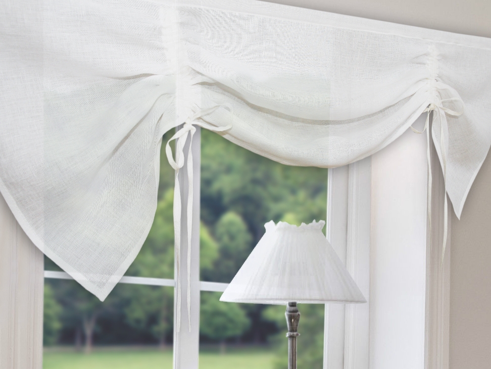 Lambrekin wykonany w 100% z delikatnej tkaniny lnianej w kolorze ecru. Tkanina marszczona jest w dwóch miejscach i wiązana lnianymi kokardkami.
