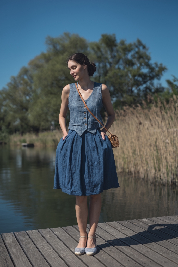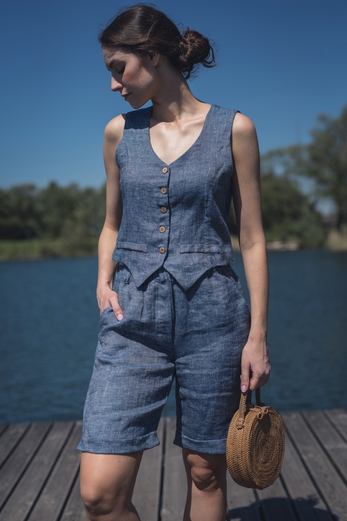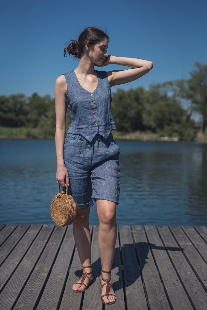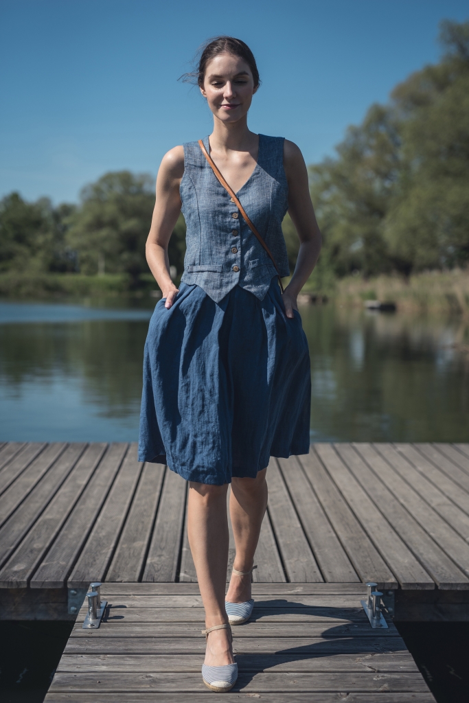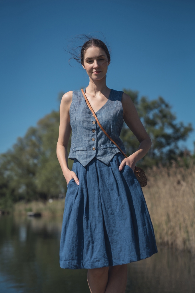 Kamizelka uszyta jest z 100% tkaniny lnianej o skośnym splocie jednostronnym w kolorze ciemno niebieskim. Z przodu zapinana na guziczki kokosowe, tył wiązany kokardką. Może być noszona luźno do sukienek , spódnic oraz spodni natomiast zapięta sprawdzi się zamiast topu.