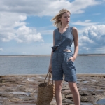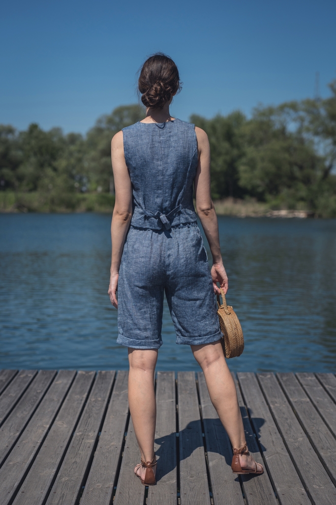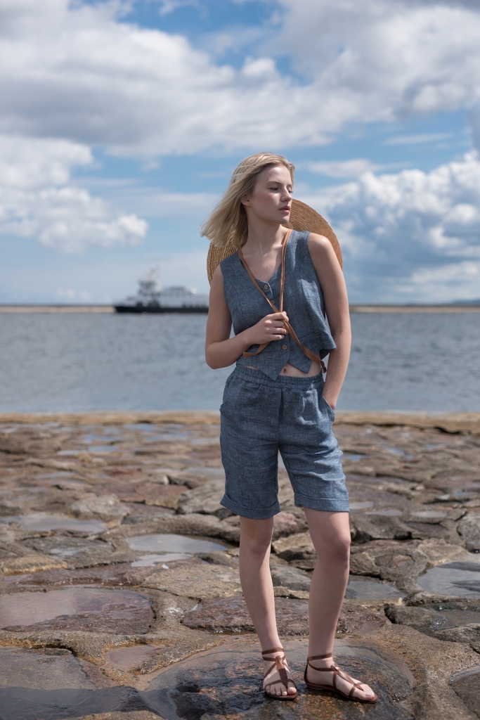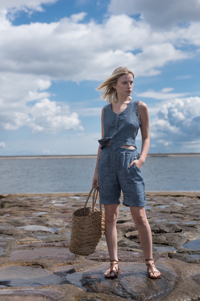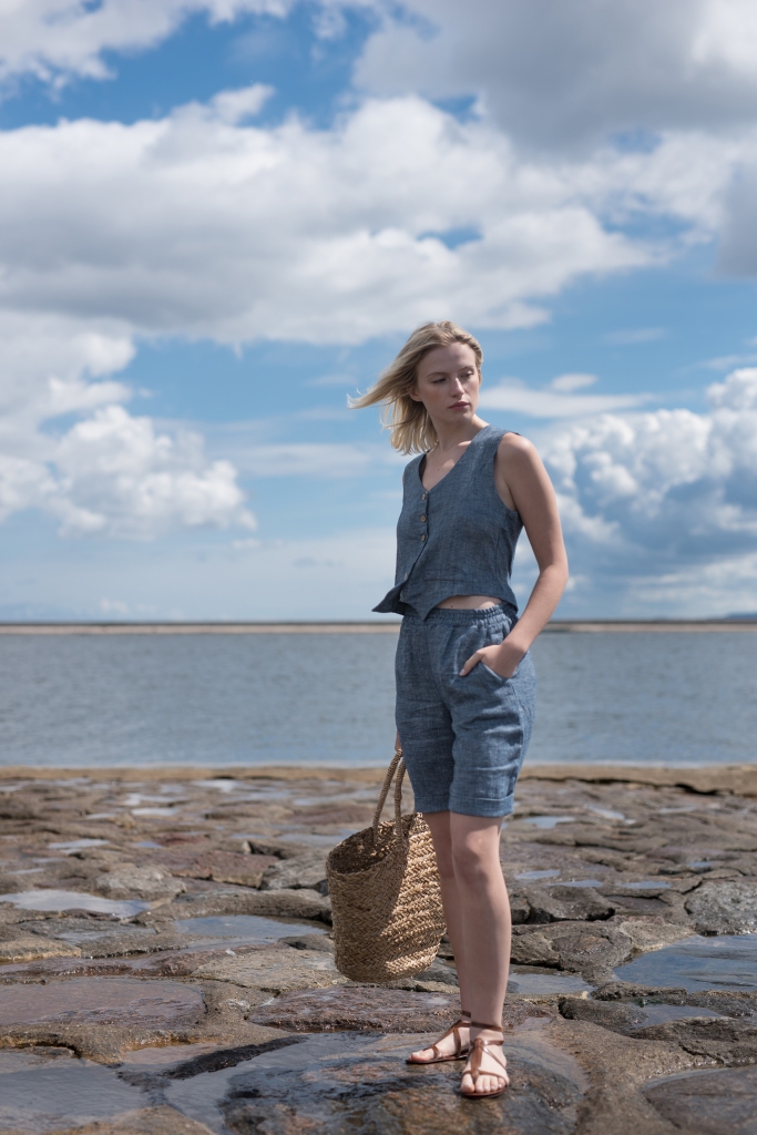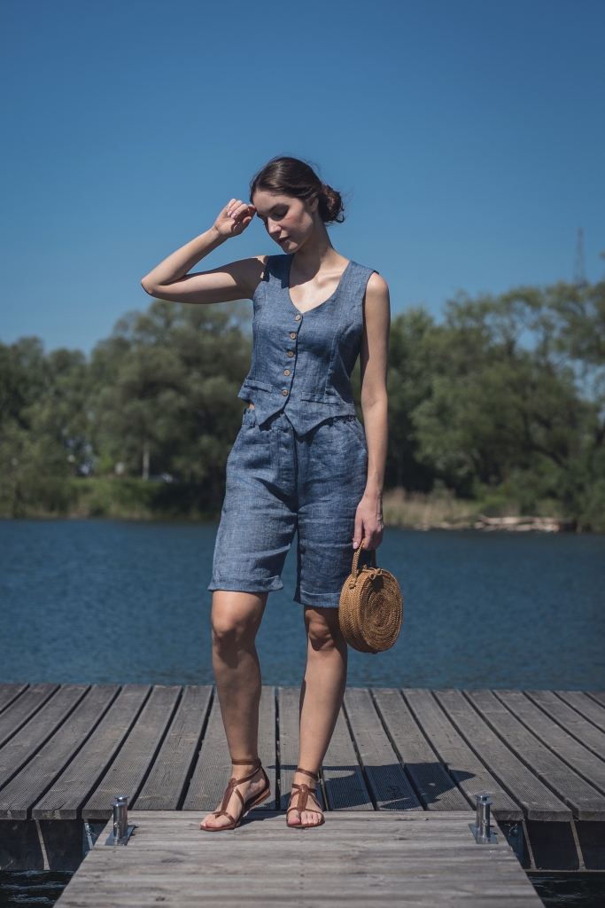 Kamizelka uszyta jest z 100% tkaniny lnianej o skośnym splocie jednostronnym w kolorze ciemno niebieskim. Z przodu zapinana na guziczki kokosowe, tył wiązany kokardką. Może być noszona luźno do sukienek , spódnic oraz spodni natomiast zapięta sprawdzi się zamiast topu.