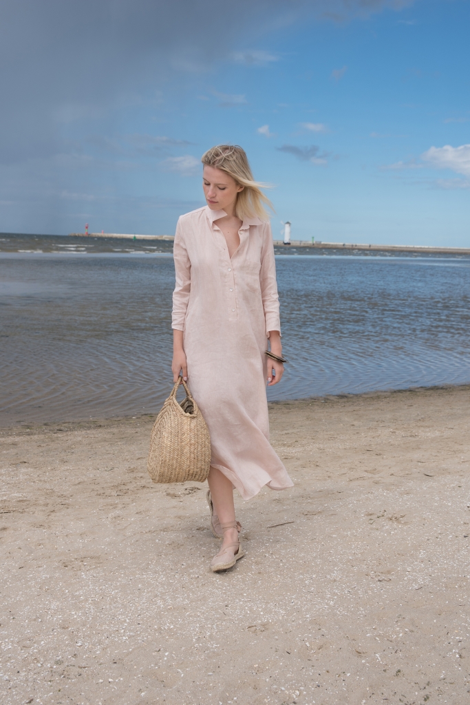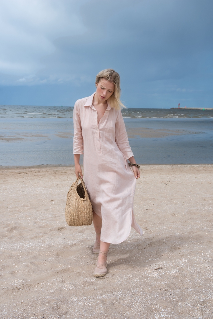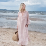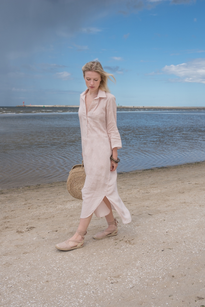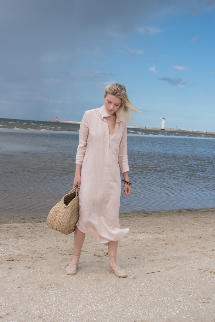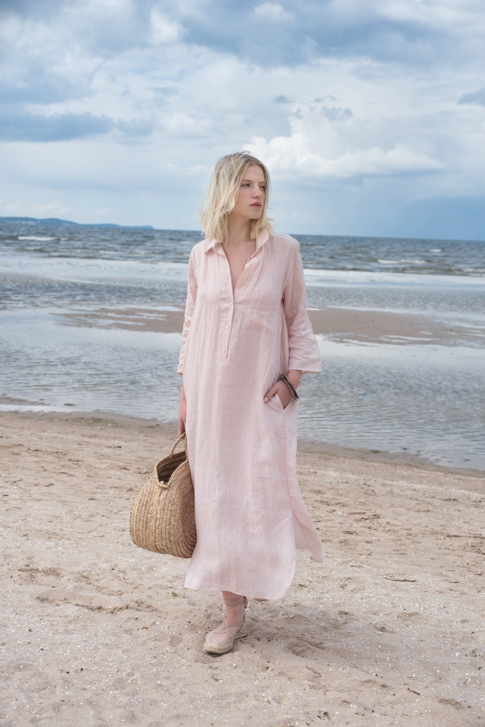 Sukienka koszulowa w kolorze jasno różowym, uszyta jest z przyjemnej w dotyku, zmiękczanej 100% tkaniny lnianej. Na dole z obu stron znajdują się rozcięcia ~26cm. Przód zapinany jest na guziczki kokosowe, na bokach są kieszenie.