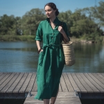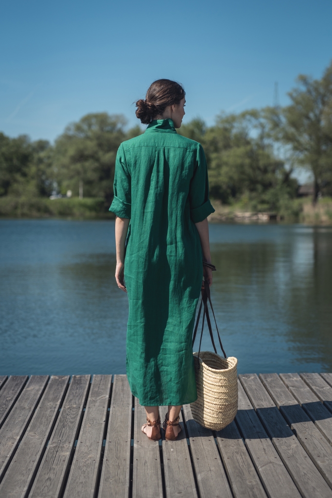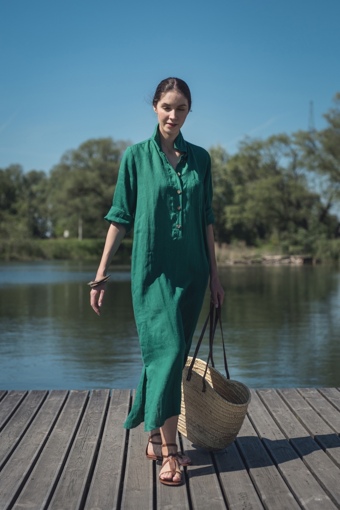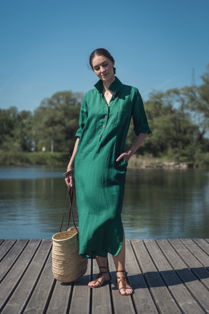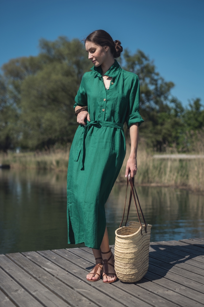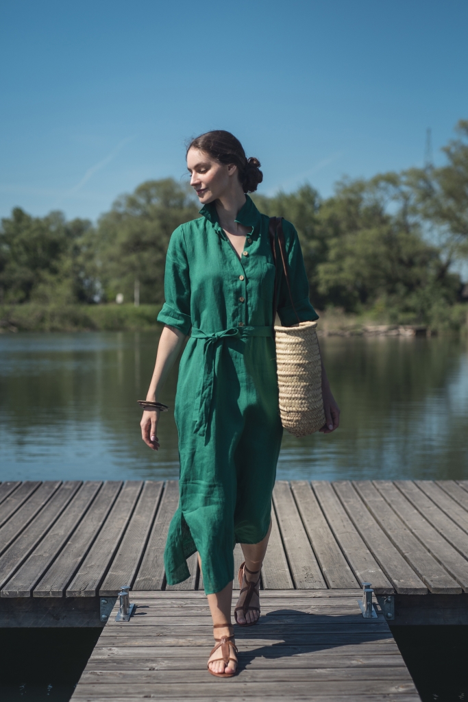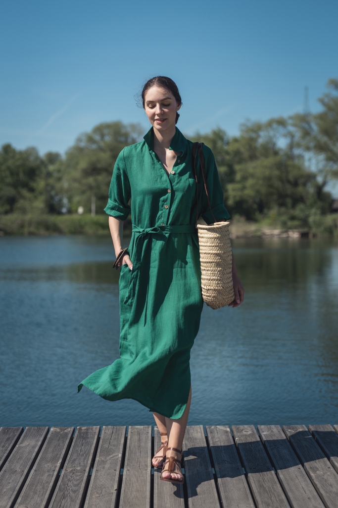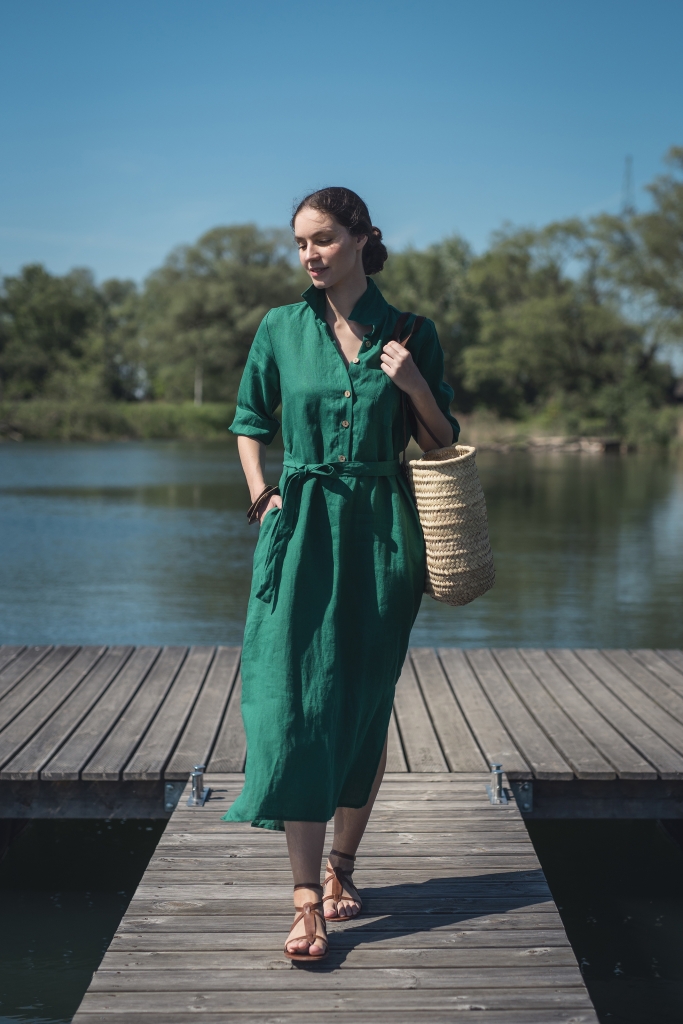 Sukienka koszulowa z paskiem lnianym w kolorze szmaragdowym, uszyta jest z przyjemnej w dotyku, zmiękczanej 100% tkaniny lnianej. Na dole z obu stron znajdują się rozcięcia ~30cm. Przód zapinany jest na guziczki kokosowe, na bokach są kieszenie.