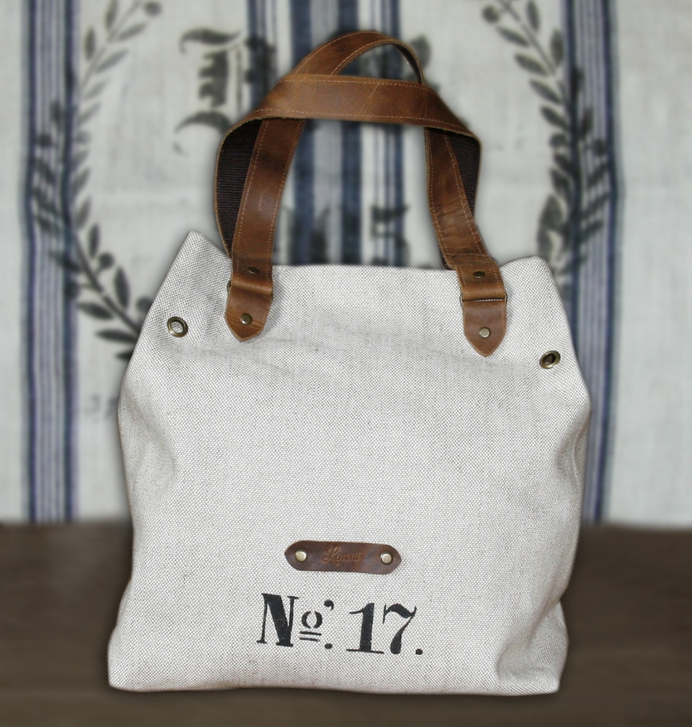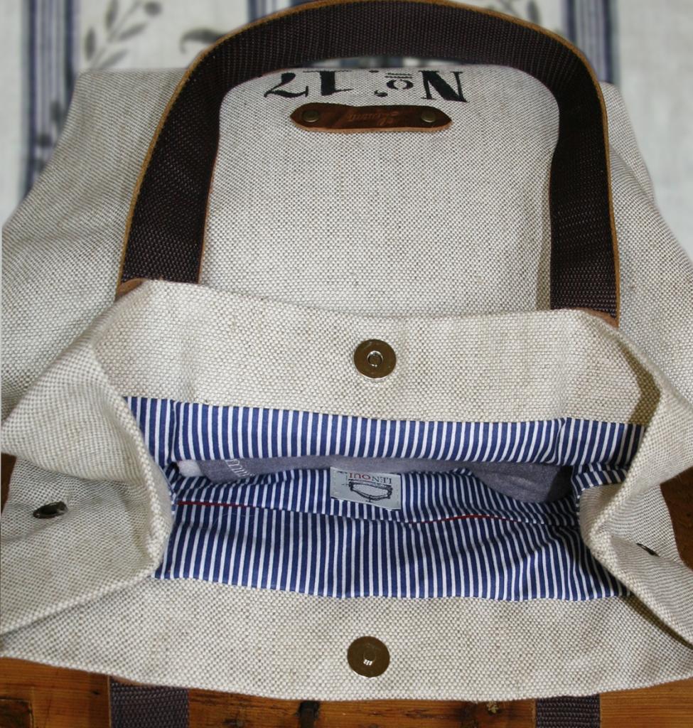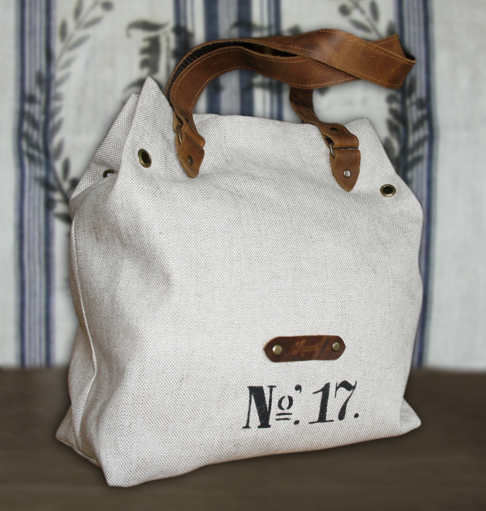 Torba lniana na ramię została uszyta z grubej tkaniny lnianej i ozdobiona nadrukowanym motywem. Uchwyty i pozostałe elementy wykonane są ze skóry. Skóra ma postarzaną fakturę, w niektórych miejscach może mieć lekkie spękania lub przebarwienia. Wewnątrz znajduje się podszewka w paski z bawełny i kieszeń na zamek błyskawiczny.