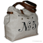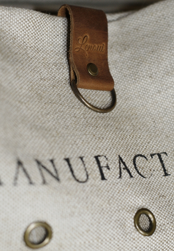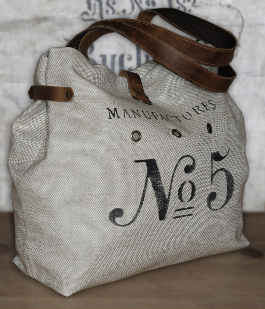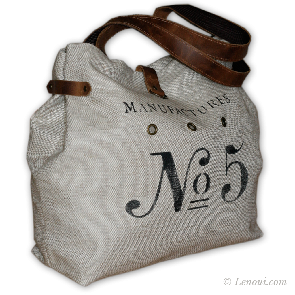 Torba na ramię została uszyta z grubej tkaniny lnianej i ozdobiona nadrukowanym motywem. Uchwyty i pozostałe elementy wykonane są ze skóry. Skóra ma postarzaną fakturę, w niektórych miejscach może mieć lekkie spękania lub przebarwienia. Wewnątrz znajduje się podszewka w paski z bawełny i kieszeń na zamek błyskawiczny.