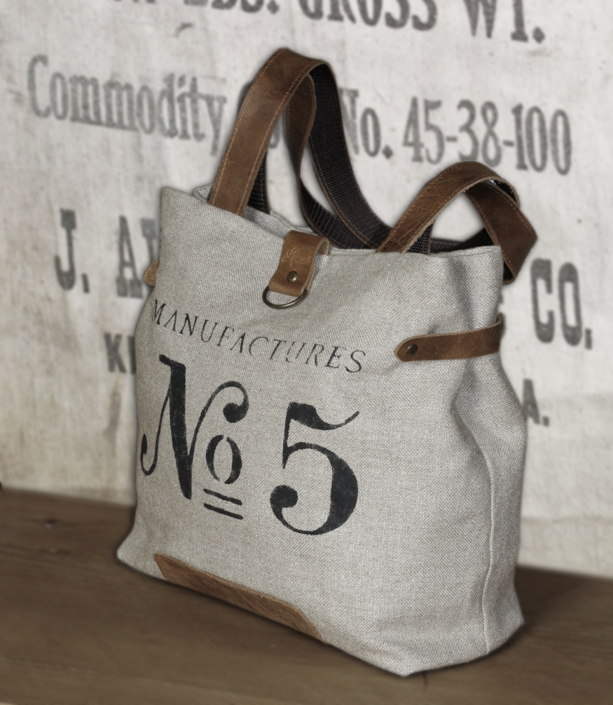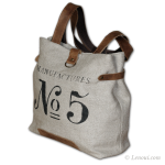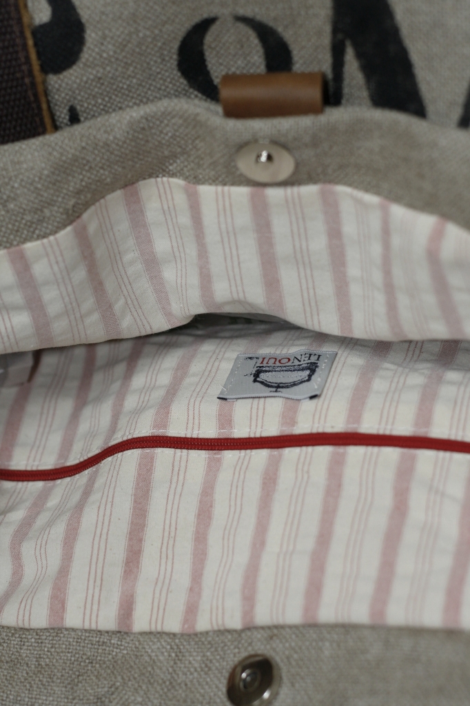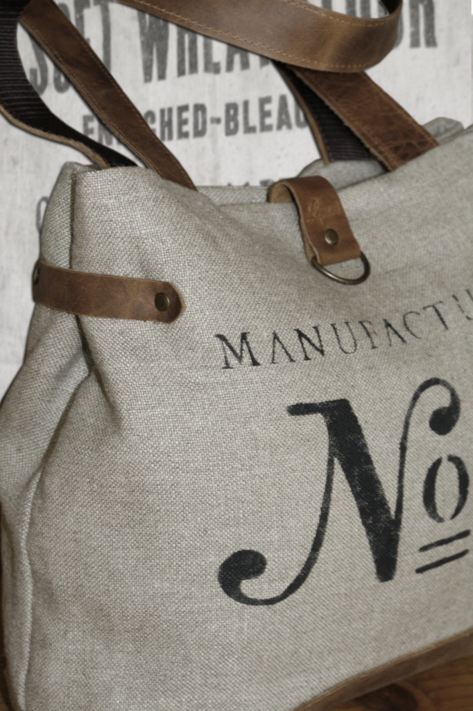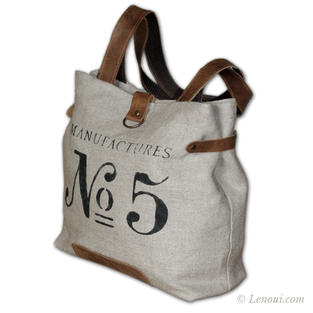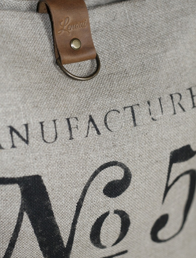 Torba na ramię została uszyta z grubej tkaniny lnianej i ozdobiona nadrukowanym motywem. Uchwyty i pozostałe elementy wykonane są ze skóry. Skóra ma postarzaną fakturę, w niektórych miejscach może mieć lekkie spękania lub przebarwienia. Wewnątrz znajduje się podszewka w paski z bawełny i kieszeń na zamek błyskawiczny.