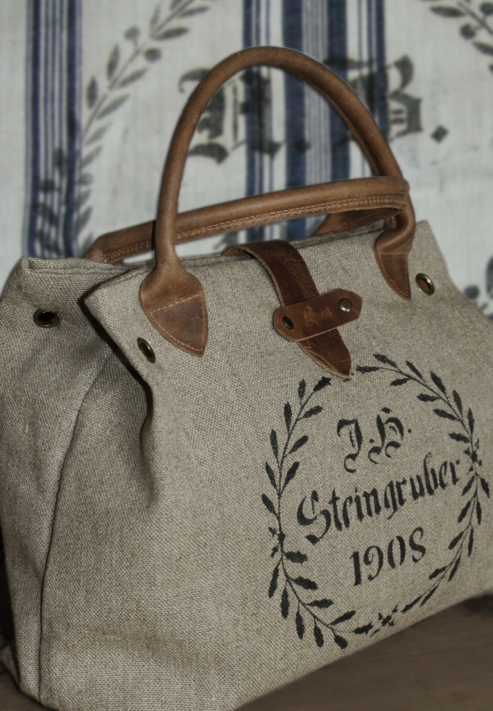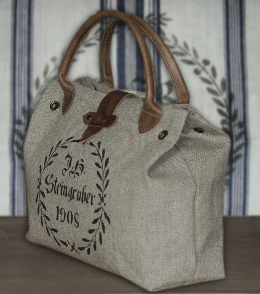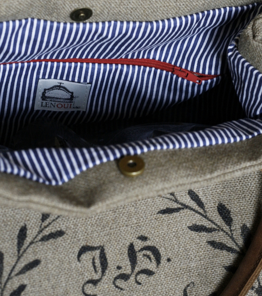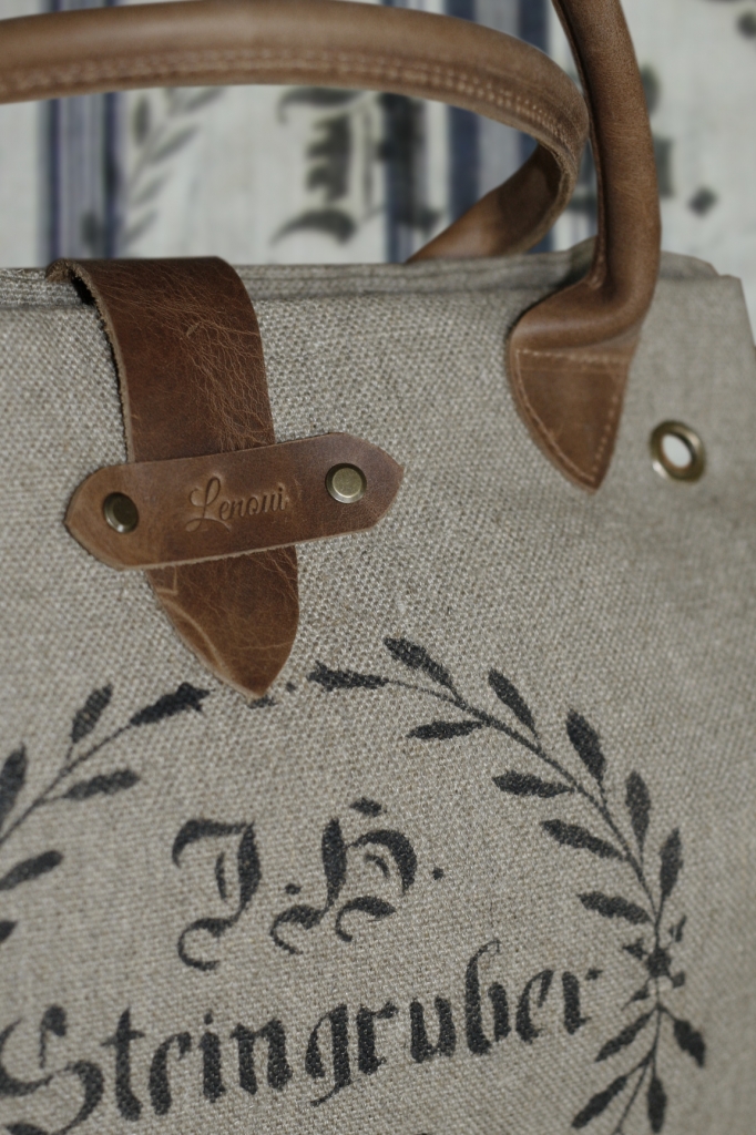 Torba do ręki została uszyta z grubej tkaniny lnianej i ozdobiona nadrukowanym motywem. Uchwyty i pozostałe elementy wykonane są ze skóry.Skóra ma postarzaną fakturę, w niektórych miejscach może mieć lekkie spękania lub przebarwienia. Wewnątrz znajduje się podszewka w paski z bawełny i kieszeń na zamek błyskawiczny.
