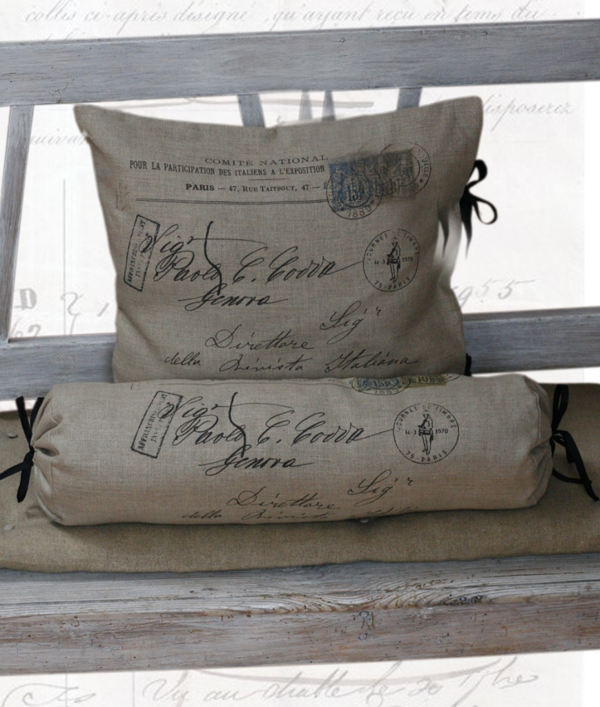 Wałeczek lniany to propozycja do wnętrza salonu, wykonany z 100% tkaniny lnianej zdobione nadrukiem z francuskimi motywami, wiązany z boku troczkami. Doskonale komponują się z poduszkami z tej samej kolekcji.
