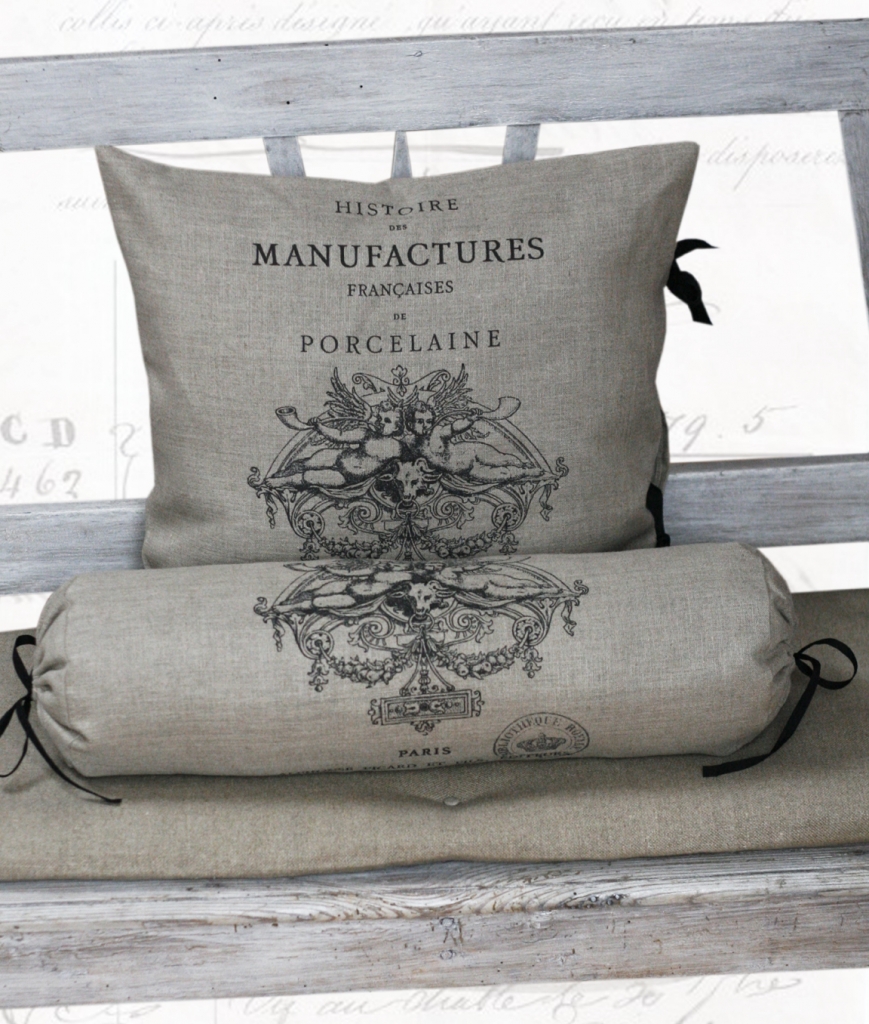 Wałeczek lniany to propozycja do wnętrza salonu, wykonany z 100% tkaniny lnianej zdobione nadrukiem z francuskimi motywami, wiązany z boku troczkami. Doskonale komponują się z poduszkami z tej samej kolekcji.